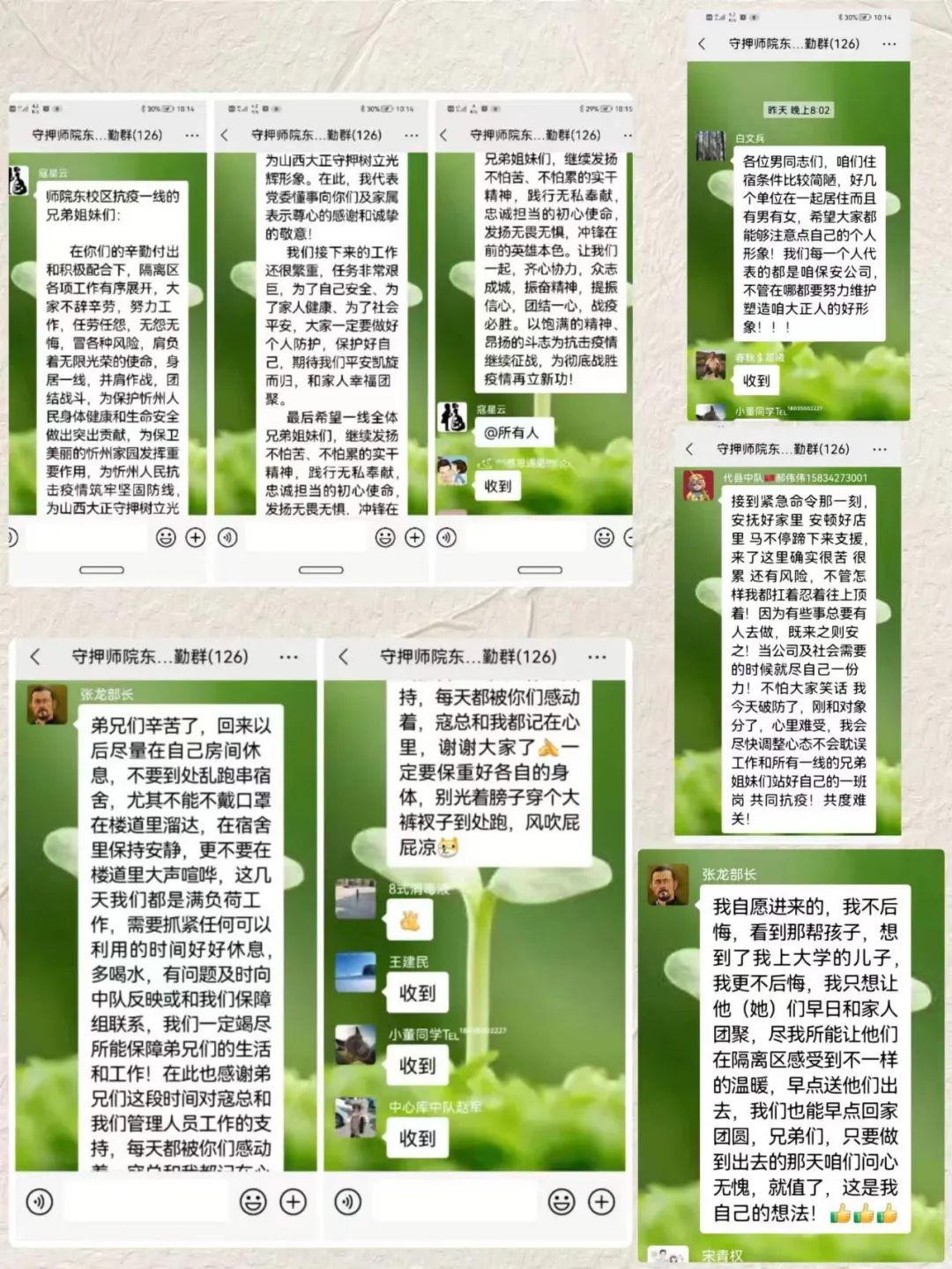 忻州師院東校區(qū)隔離點正式啟用后,寇星云、郭二平分別帶領(lǐng)以守押公司、億通公司人員為主組建的工作區(qū)、隔離區(qū)兩支黨員突擊分隊進(jìn)駐相應(yīng)區(qū)域,以機關(guān)和守押監(jiān)控中心、物業(yè)公司、刻章公司、億通公司、文化藝術(shù)公司等單位人員組建的其它三支黨員突擊分隊在外負(fù)責(zé)保障餐食、物資供應(yīng)。餐食物資保障分隊隊員既要克服重重困難采購所需食材和生活物資、合理搭配菜譜,又要在保溫、包裝等方面想辦法、下功夫,盡量根據(jù)隔離人員不同口味做到差異化安排搭配,保證葷素搭配、營養(yǎng)均衡,盡最大程度滿足隔離人員每日的營養(yǎng)需求。預(yù)備應(yīng)急分隊隊員往往身兼數(shù)職,哪里需要到哪里,一會幫忙搬運物資,一會幫忙分裝水果、面包、餅干等輔食,忙的馬不停蹄。餐食物資運輸隊員根據(jù)實際,科學(xué)合理調(diào)配車輛和路線,保證將餐食、生活物資按時送達(dá)。在隔離點一線的工作區(qū)、隔離區(qū)隊員,在做好餐食、物資配送的基礎(chǔ)上,積極協(xié)調(diào)解決隔離人員的合理訴求,讓隔離點如家般溫暖常在,做到了隔離人員、工作人員、隔離點領(lǐng)導(dǎo)組“三滿意”。