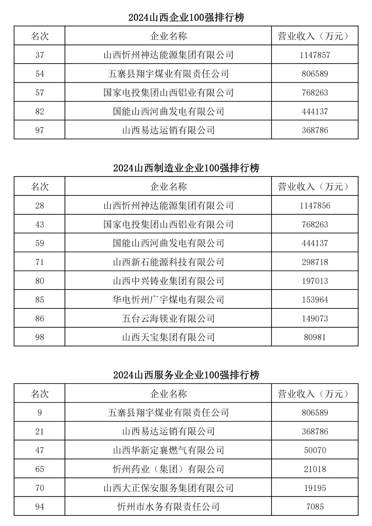 今年是山西省企業(yè)聯(lián)合會(huì)、山西省企業(yè)家協(xié)會(huì)連續(xù)第二十一年向社會(huì)發(fā)布“山西企業(yè)100強(qiáng)排行榜”,同時(shí)發(fā)布《山西企業(yè)100強(qiáng)(年度)發(fā)展報(bào)告》。2024山西企業(yè)100強(qiáng)營(yíng)業(yè)收入總額26041.18億元,比上年略有降低;入圍門檻35.8億元,比上年增加了5.32億元,平均資產(chǎn)總額比上年增加了17.63%,平均凈利潤(rùn)比上年增長(zhǎng)了0.49%。晉能控股集團(tuán)有限公司以營(yíng)業(yè)收入4505.2億元排名第一;山西焦煤集團(tuán)有限責(zé)任公司以營(yíng)業(yè)收入2373.89億元排名第二;潞安化工集團(tuán)有限公司以營(yíng)業(yè)收入1730億元排名第三。2024年山西省百?gòu)?qiáng)企業(yè)中有2家企業(yè)躋身世界企業(yè)500強(qiáng);有10家企業(yè)入圍中國(guó)企業(yè)500強(qiáng);有5家企業(yè)入圍中國(guó)制造業(yè)企業(yè)500強(qiáng);有3家企業(yè)入圍中國(guó)服務(wù)業(yè)企業(yè)500強(qiáng)。