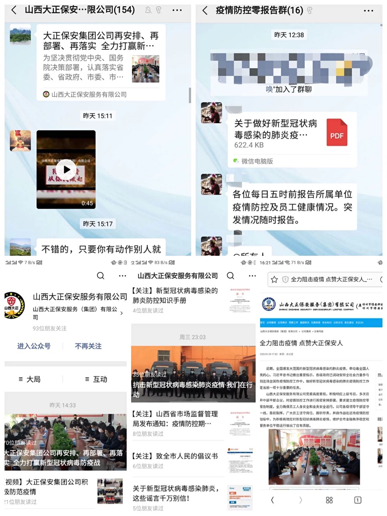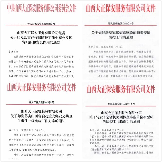 為深入貫徹習(xí)近平總書記對新型冠狀病毒感染肺炎疫情防控工作的重要指示精神,堅(jiān)決落實(shí)黨中央重大決策部署及省委、市委、市國資委部署安排,山西大正保安服務(wù)(集團(tuán))有限公司印發(fā)《關(guān)于做好新型冠狀病毒感染的肺炎疫情防控工作的通知》、《山西大正保安服務(wù)有限公司關(guān)于印發(fā)落實(shí)山西省啟動重大突發(fā)公共衛(wèi)生事件一級響應(yīng)工作方案的通知》,要求公司各部門把防控疫情作為當(dāng)前最重要的工作來抓,落實(shí)落細(xì)防控措施,切實(shí)保障員工安全,保障全市金融秩序穩(wěn)定和服務(wù)單位平穩(wěn)運(yùn)行。集團(tuán)公司黨委印發(fā)了落實(shí)在疫情防控工作中充分發(fā)揮黨組織和黨員作用的通知,要求基層黨支部、全體黨員深刻認(rèn)識疫情防控形勢,全面落實(shí)我市“五嚴(yán)五防”措施,用實(shí)際行動踐行初心使命。