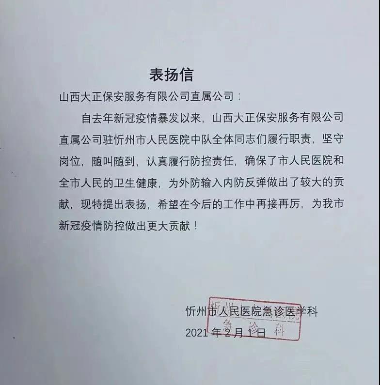 當(dāng)前,境外新冠肺炎疫情暴發(fā)增長(zhǎng)態(tài)勢(shì)仍在持續(xù),國(guó)內(nèi)疫情防控形勢(shì)依然嚴(yán)峻,尤其是近期河北、黑龍江等地發(fā)現(xiàn)新冠肺炎確診病例,給我們敲響了警鐘。山西省委、省政府高度重視疫情防控工作,明確提出要嚴(yán)格落實(shí)外防輸入措施,堅(jiān)決守住疫情防控底線。山西大正保安服務(wù)(集團(tuán))有限公司堅(jiān)持以人民利益為中心,秉承公司“服從大局、服務(wù)社會(huì)”宗旨,始終認(rèn)清疫情防控形勢(shì),堅(jiān)決克服麻痹思想和厭戰(zhàn)情緒,慎終如始、竭盡全力,緊密配合服務(wù)單位筑牢疫情防控安全網(wǎng),是國(guó)有保安企業(yè)堅(jiān)守一線,打贏疫情防控阻擊戰(zhàn)的真實(shí)寫(xiě)照。