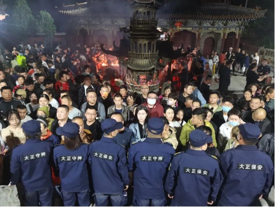 凌晨0點過后,車流量、人流量逐步增多,還愿、許愿香客絡(luò)繹不絕,執(zhí)勤隊員一邊要維持秩序,一邊還要檢查是否攜帶香火蠟燭燈等易燃物品進入寺廟。凌晨0時直到次日中午12時在長達 24個小時的時間里,公司帶隊領(lǐng)導(dǎo)和隊員們始終堅守在一線,充分體現(xiàn)了大正保安人紀律嚴明、吃苦耐勞、能打硬仗、團結(jié)一致的優(yōu)良作風(fēng)。執(zhí)勤中,全體保安隊員堅守崗位、履職盡責(zé)、文明執(zhí)勤,維持秩序、服務(wù)群眾,營造了安全祥和的氣氛,圓滿完成了此次廟會安保活動,展示了國企保安專業(yè)水準和良好的精神風(fēng)貌。
