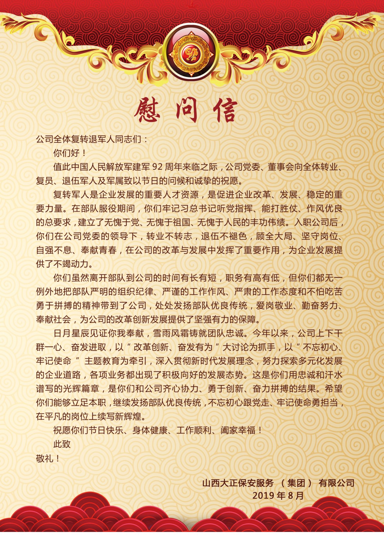 黨委委員、副總經(jīng)理趙培宏宣讀《慰問信》,信中談到:公司的每位復轉(zhuǎn)軍人都是企業(yè)發(fā)展的重要人才資源,是促進企業(yè)改革、發(fā)展、穩(wěn)定的重要力量,處處發(fā)揚著部隊優(yōu)良傳統(tǒng),為公司的改革創(chuàng)新發(fā)展提供了堅強有力的保障。希望大家能夠以“改革創(chuàng)新、奮發(fā)有為”大討論為抓手,以“不忘初心、牢記使命”主題教育為牽引,立足本職,發(fā)揚部隊優(yōu)良傳統(tǒng),不忘初心跟黨走、牢記使命勇?lián),在平凡的崗位上續(xù)寫新輝煌。