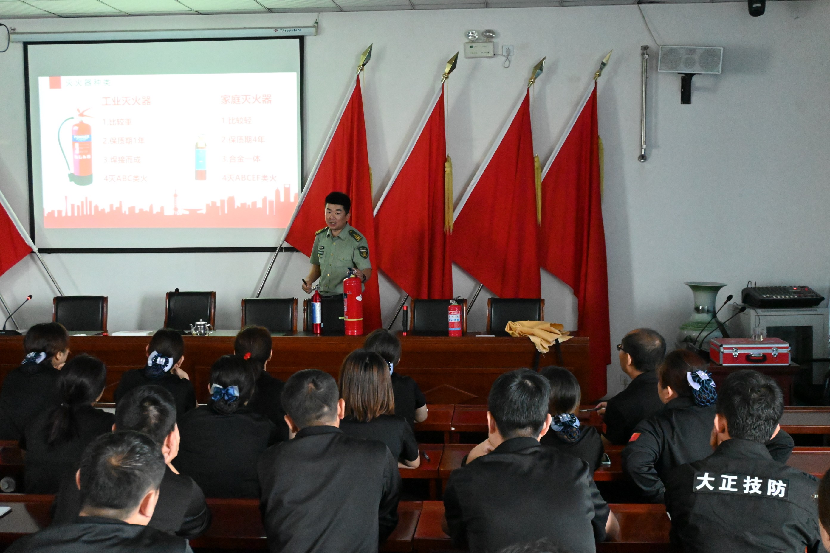 培訓(xùn)課上,張教官從火災(zāi)定義、火災(zāi)種類、滅火工具、防范措施幾方面現(xiàn)場教學(xué),通過視頻播放的方式,以觸目驚心的火災(zāi)案例警示短片,向大家展示了建筑、倉庫、公共場所、車輛、居家等區(qū)域的消防安全隱患,給大家敲響消防安全警鐘。其次是對日常生活中和公共聚集場所的防火安全知識做了詳細(xì)的介紹,同時還對滅火器的選擇與使用以及火場應(yīng)急措施與逃生進(jìn)行了全面的講解。