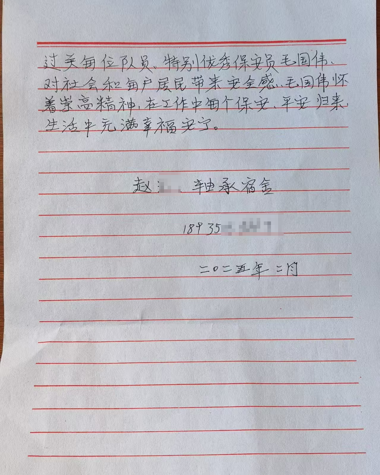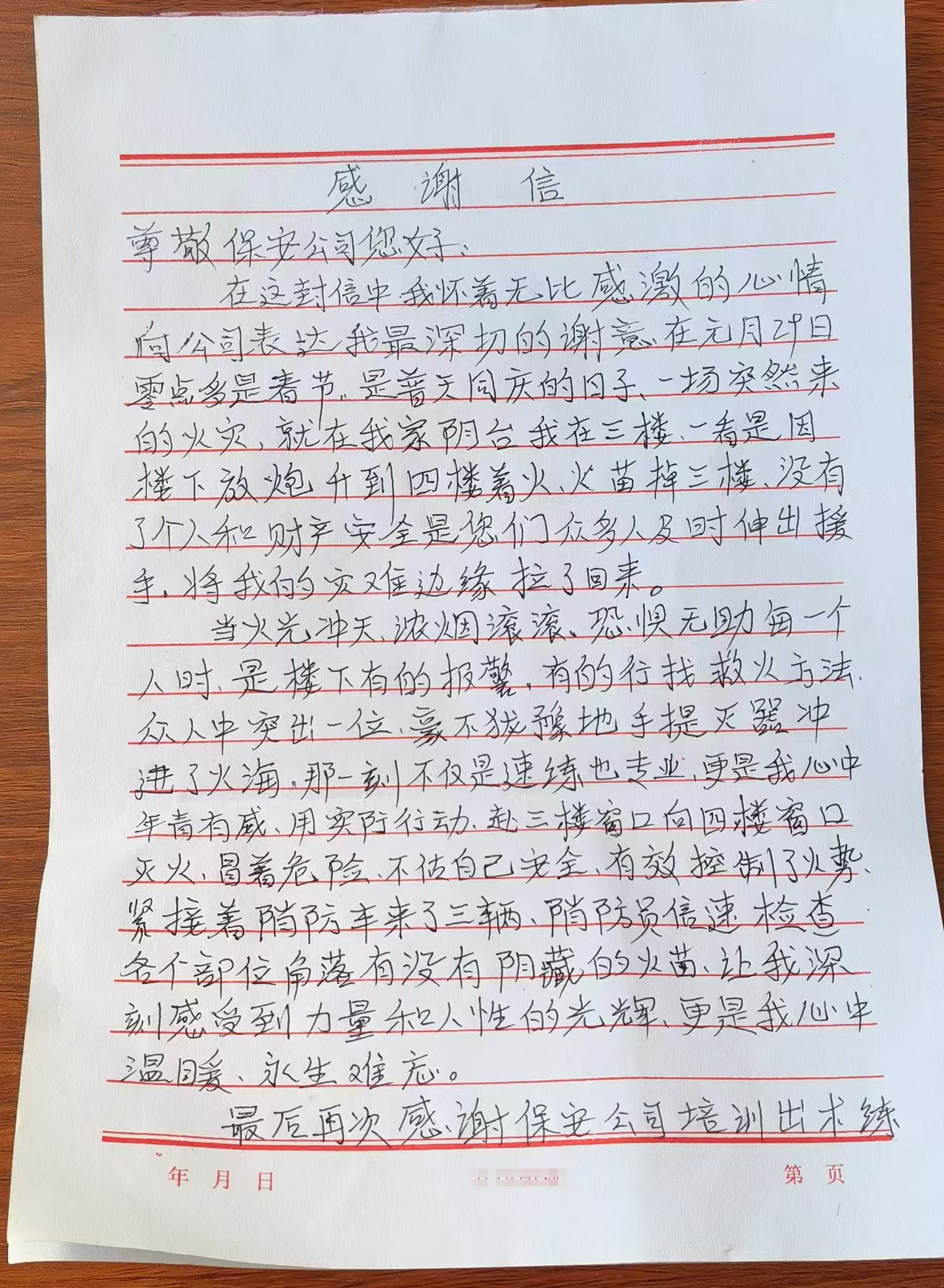 在感謝信中,兩位老人用質(zhì)樸的語言表達(dá)了對毛國偉的深深感激,并對忻州市保安服務(wù)公司表示高度贊揚(yáng)。此次應(yīng)急處置事件不僅展現(xiàn)了毛國偉個人的專業(yè)素養(yǎng)和勇敢精神,更是忻州市保安服務(wù)公司注重安全生產(chǎn)、常態(tài)化開展消防安全培訓(xùn)和應(yīng)急處突演練的成果體現(xiàn)。